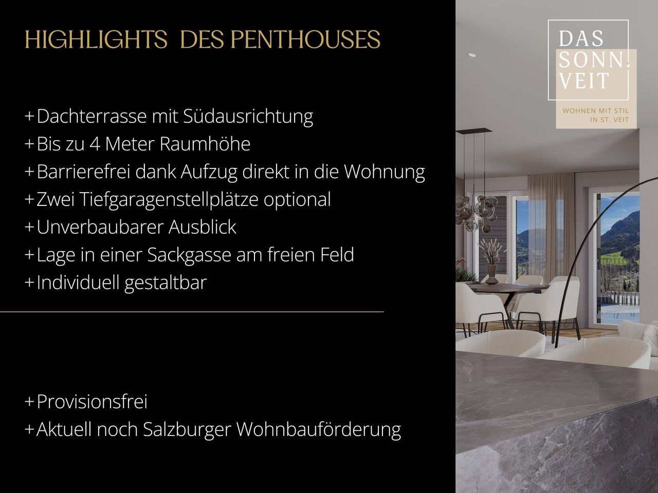 In einem kleinen, hochwertigen Neubauprojekt in herrlicher Sonnenlage von St. Veit entsteht dieses Penthouse mit Blick über das Salzachtal! Das Projekt glänzt mit Barrierefreiheit dank Aufzug direkt in die Wohnung, großzügiger Tiefgarage und einer Lage am Ende einer Sackgasse mit unverbaubarem Blick.