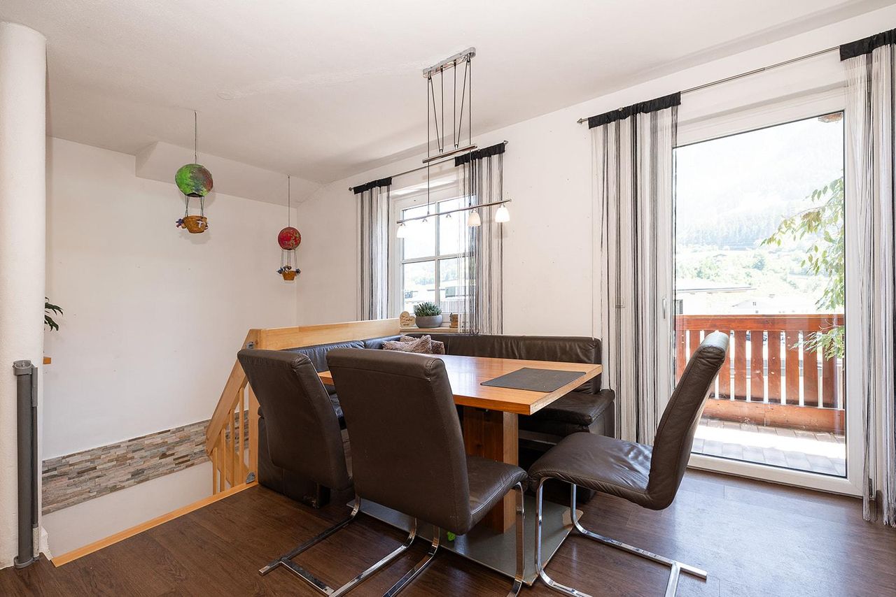 Der lichtdurchflutete Essbereich bildet das Herzstück der Wohnung. Durch die großen Fenster fällt viel Tageslicht, und der direkte Zugang zum sonnigen Balkon macht diesen Bereich zu einem Ort, an dem man gerne ankommt, verweilt und die klare Bergluft genießt. Die angrenzende Küche ist offen gestaltet, bietet reichlich Stauraum und schafft eine harmonische Verbindung zwischen Kochen, Genießen und Zusammenkommen.