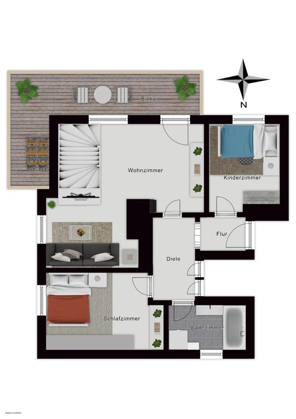 Besonderer Hinweis: Die Treppe innerhalb der Wohnung führt in die darüberliegende Einheit – diese wird jedoch beim Kauf entfernt