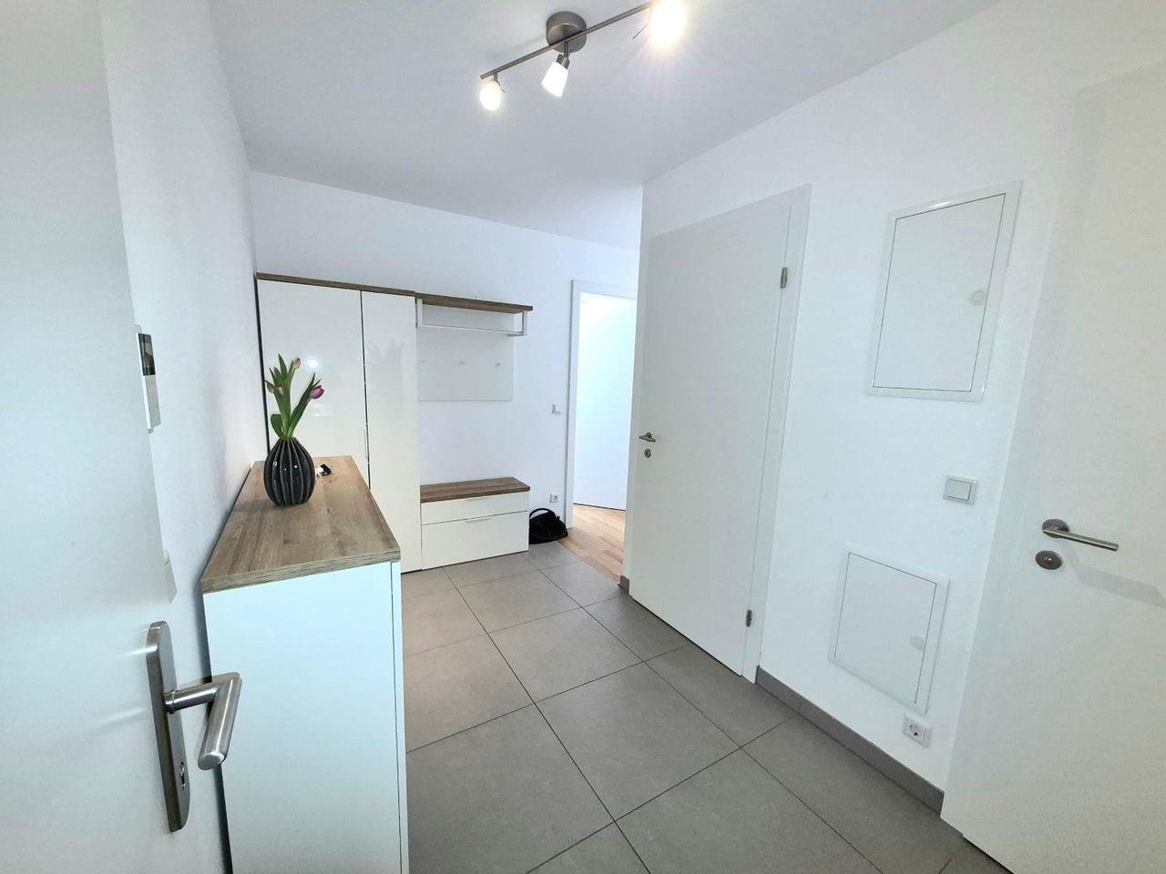 2-Schichtparkettboden Eiche seidenmatt lackiert (emissonsfrei) im Wohnbereich und 60x60cm Feinsteinzeug Fliesen im Sanitärbereich runden das Angebot ab, Einlagerungsraum, Videogegensprechanlage, Garagenplatz kann optional für EUR 28.500,- erworben werden, Kinderwagenabstellraum, Fahrradabstellplatz