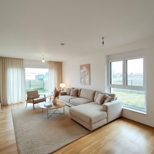 Die schicke 3-Zimmerwohnung im Erdgeschoss betritt man durch den gepflegten Eingangsbereich, welcher ausreichend Platz für eine Garderobe sowie den zentralen Zugang zu allen Räumlichkeiten der Wohnung bietet. Unmittelbar links vom Eingangsbereich befindet sich das Badezimmer mit Badewanne und einem seperat angelegten WC. Beide Nassräume sind durchgehend mit modernen Fließen ausgestattet. Ein Abstellraum schafft Stauraum für nützliche Alltagsgegenstände. Die beiden Schlafräume sind ca. gleich groß, wobei sich als Master-Bedroom das rechte auszeichnet, da es eine Spur größer ist. Der zweite Schlafraum bietet sich idealerweise als Büro an, z.B. um Homeoffice zu betreiben. Der Wohn- Essbereich ist mit einer Einbauküche sowie modernen Gerätschaften ausgestattet. Die großen Fenster sorgen für viel Licht im Wohnraum, der helle Parkett lässt den Raum offen und freundlich wirken. Die sonnige, idyllische Terrasse gewährt mitsamt einer Gartenfläche von 43,00m² Ruhe und Erholung und hat eine angenehme Größe für einen geselligen Grillabend.