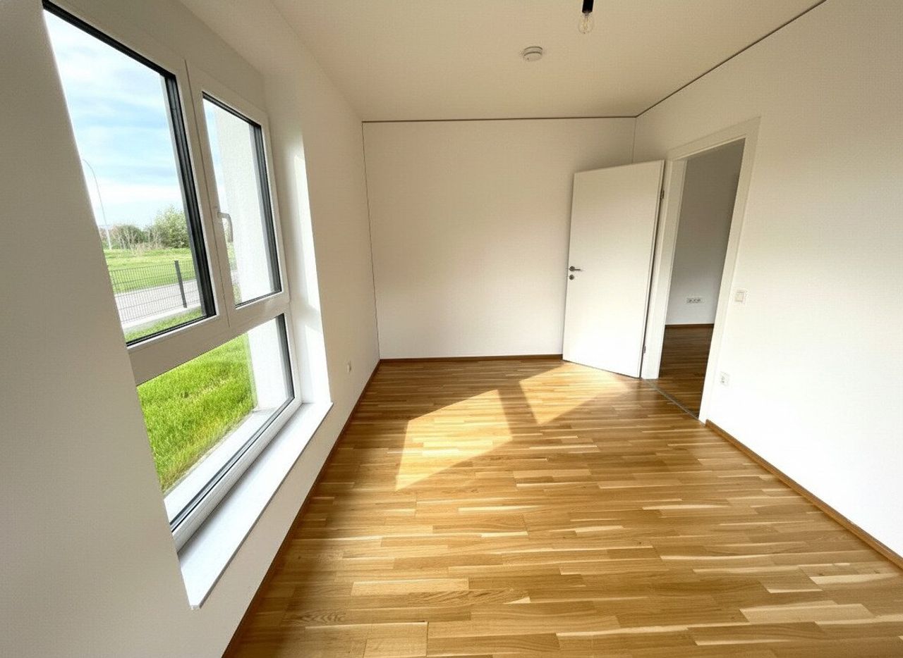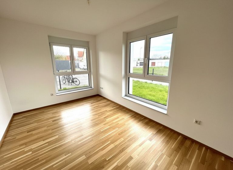 Die schicke 3-Zimmerwohnung im Erdgeschoss betritt man durch den gepflegten Eingangsbereich, welcher ausreichend Platz für eine Garderobe sowie den zentralen Zugang zu allen Räumlichkeiten der Wohnung bietet. Unmittelbar rechts vom Eingangsbereich befindet sich das Badezimmer mit Duschbadewanne und ein separates WC. Beide Nassräume sind durchgehend mit modernen Fliesen ausgestattet. Ein Abstellraum schafft Stauraum für nützliche Alltagsgegenstände. Die beiden Schlafräume sind ca. gleich groß, wobei sich als Master-Bedroom das rechte auszeichnet, da es eine Spur größer ist. Der zweite Schlafraum bietet sich idealerweise als Büro an, z.B. um Homeoffice zu betreiben. Der Wohn- Essbereich ist mit einer Einbauküche sowie modernen Gerätschaften ausgestattet. Die großen Fenster sorgen für viel Licht im Wohnraum, der helle Parkett lässt den Raum offen und freundlich wirken. Die sonnige, idyllische Terrasse gewährt mitsamt einer Gartenfläche von 45,00m² Ruhe und Erholung und hat eine angenehme Größe für einen geselligen Grillabend.