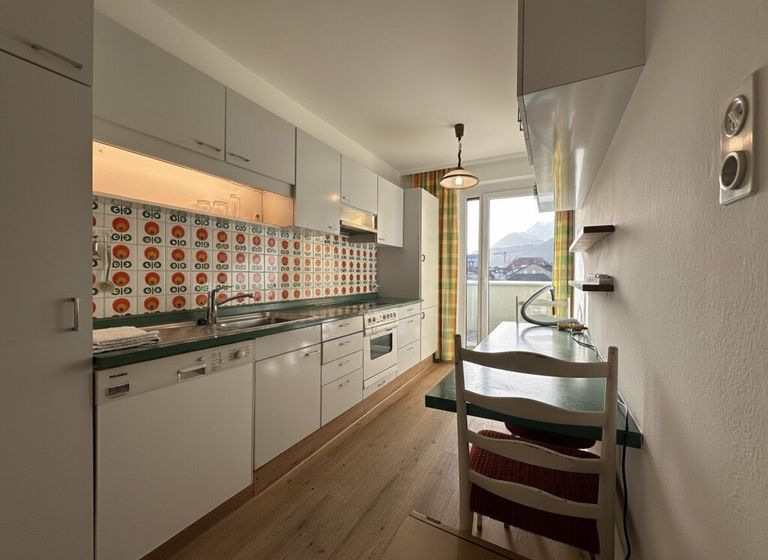 Die separate Küche ist gepflegt und funktional angeordnet und verfügt ebenfalls über einen eigenen Balkonzugang. Zusätzlich besteht im vorderen Bereich der Wohnung die Möglichkeit, eine weitere Küche zu installieren, wodurch eine spätere Teilung der Wohnung besonders einfach realisierbar ist.