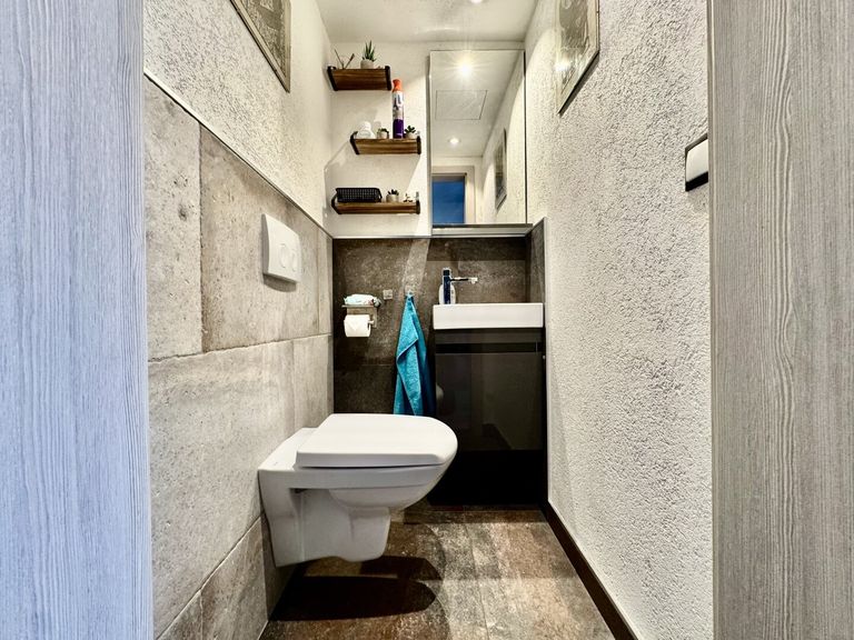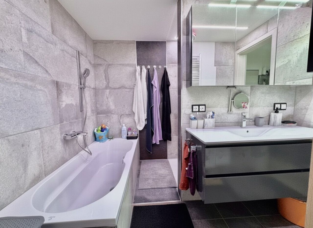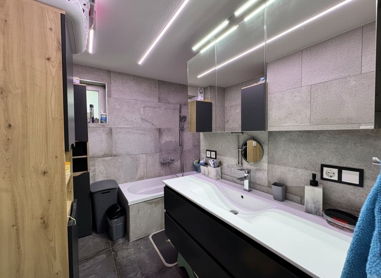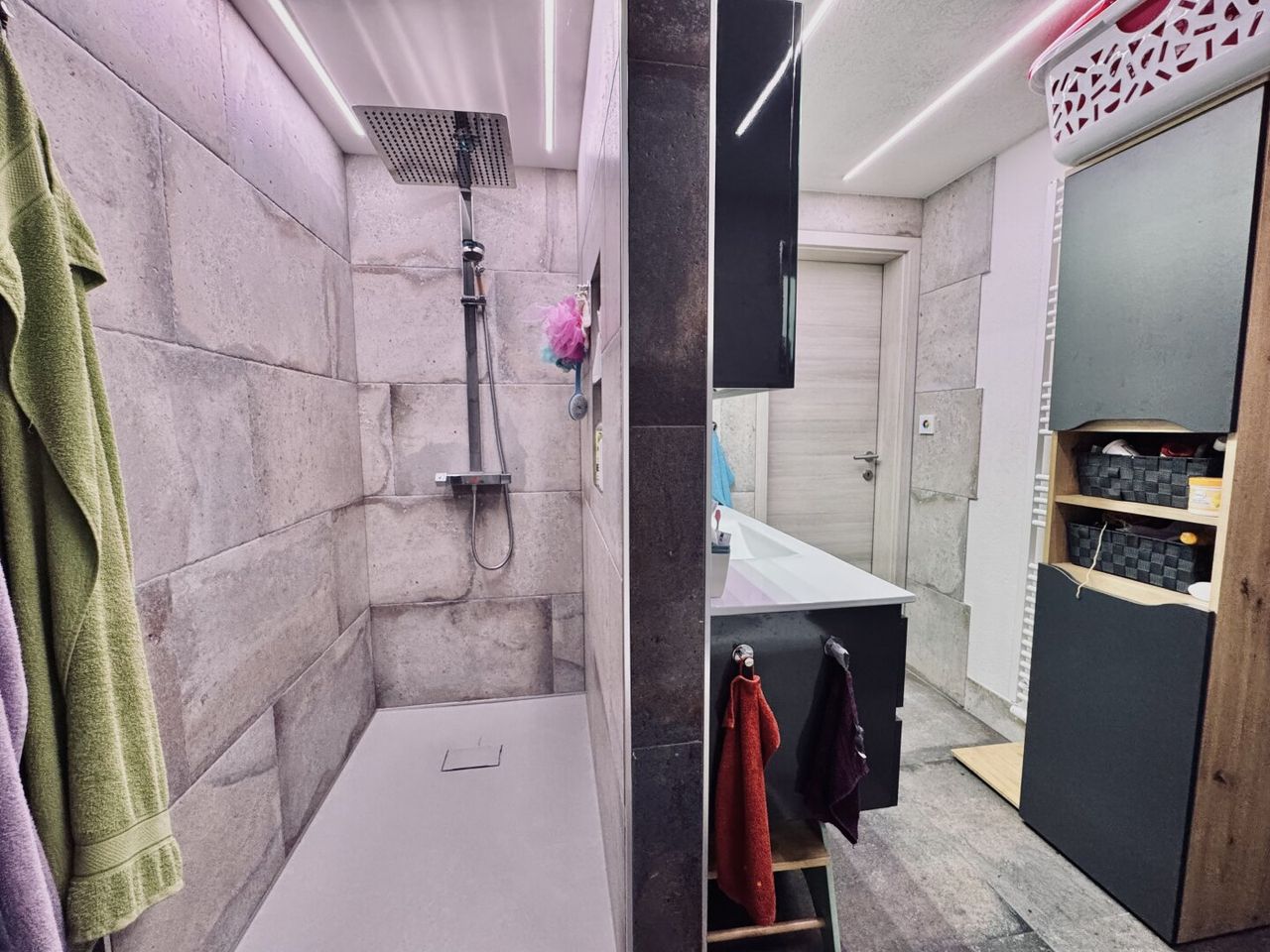 Badezimmer modernisiert 2022 mit großformatigen Steinfliesen, moderner Dusche, Badewanne, WC und Einbau für Waschmaschine/Trockner