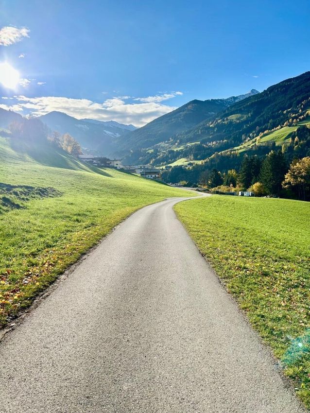 Auf dem Weg zur Wohnung fahren Sie an idyllischen Wiesen vorbei und erfreuen sich an der unberührten Schönheit der Tiroler Landschaft.