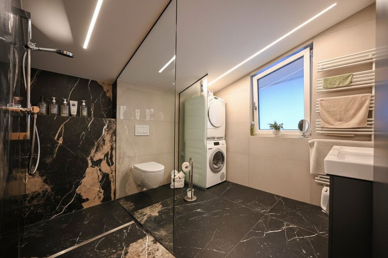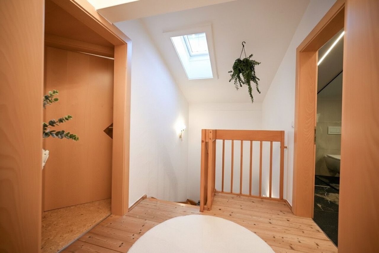 Die Dachschrägen im oberen Geschoss verleihen den Räumen zusätzliche Wohnlichkeit und Struktur, ohne dabei an Nutzfläche einzubüßen – ein architektonisches Detail, das die Wohnung besonders gemütlich macht.