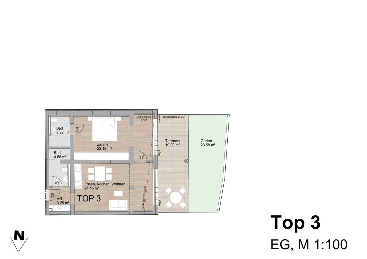 Es bietet neben einem großzügigen Schlafzimmer, zwei Badezimmer mit eben begehbarer Dusche samt Rainshower, ein Waschbecken mit Untertischkasten und LED Spiegelschrank, Handtuchtrockner und WC, einen geräumigen Wohn- Küchenbereich und Garderobenbereich.