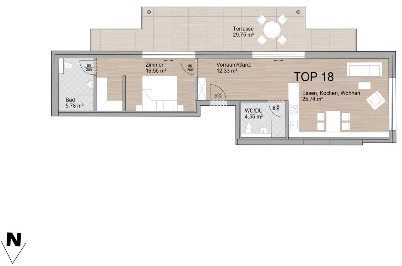 Es bietet neben einem großzügigen Schlafzimmer, zwei Badezimmer mit eben begehbarer Dusche samt Rainshower, ein Waschbecken mit Untertischkasten und LED Spiegelschrank, Handtuchtrockner und WC, einen geräumigen Wohn- Küchenbereich und Garderobenbereich.