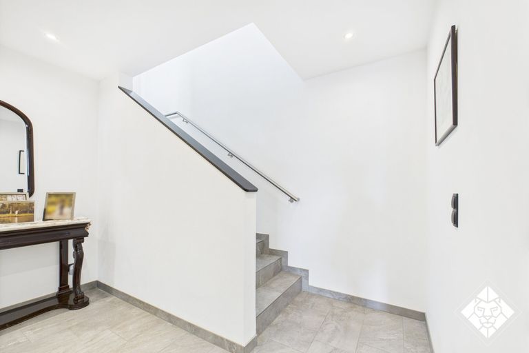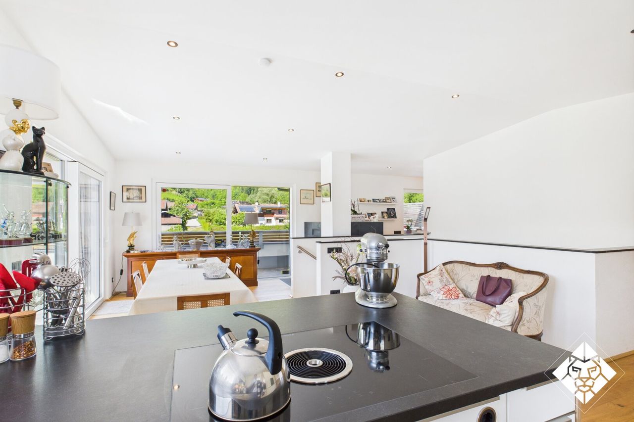 Offener Wohn- & Essbereich mit Kachelofen Über eine elegante Treppe erreichen Sie den lichtdurchfluteten Wohnbereich mit Zugang zur Dachterrasse. Ein stilvoller Kachelofen sorgt für gemütliche Abende, die offene Gestaltung schafft ein...