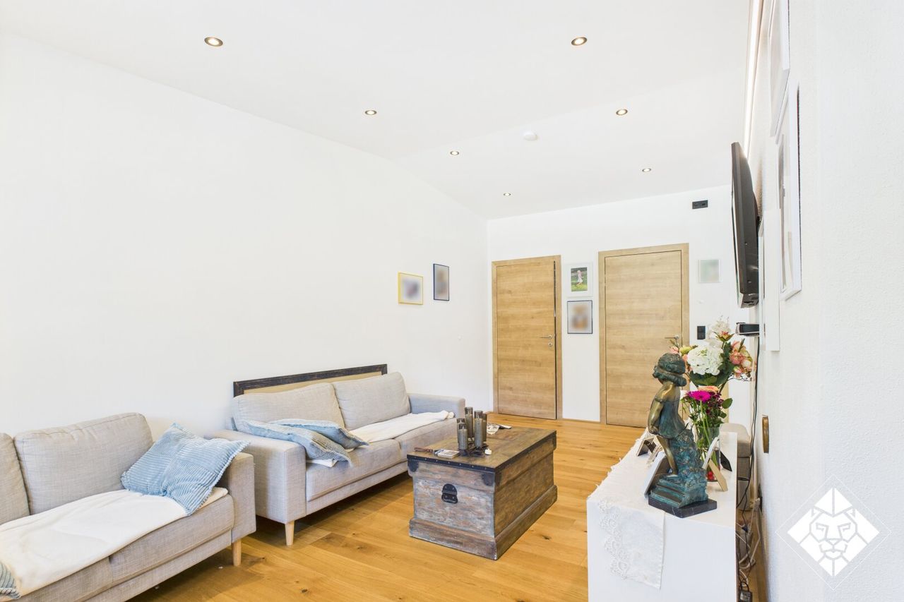 Über eine elegante Treppe erreichen Sie den lichtdurchfluteten Wohnbereich mit Zugang zur Dachterrasse. Ein stilvoller Kachelofen sorgt für gemütliche Abende, die offene Gestaltung schafft ein großzügiges Raumgefühl.