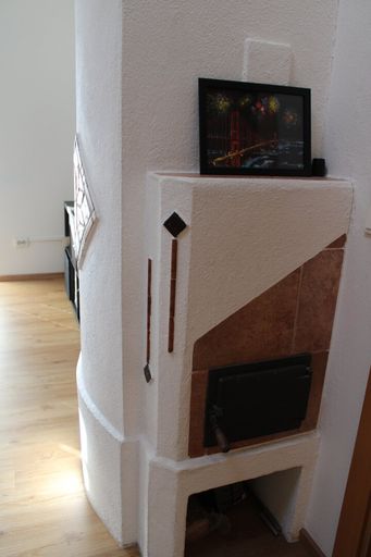 Der Kachelofen im Wohnzimmer sorgt für eine behagliche Wärme an kalten Winterabenden.