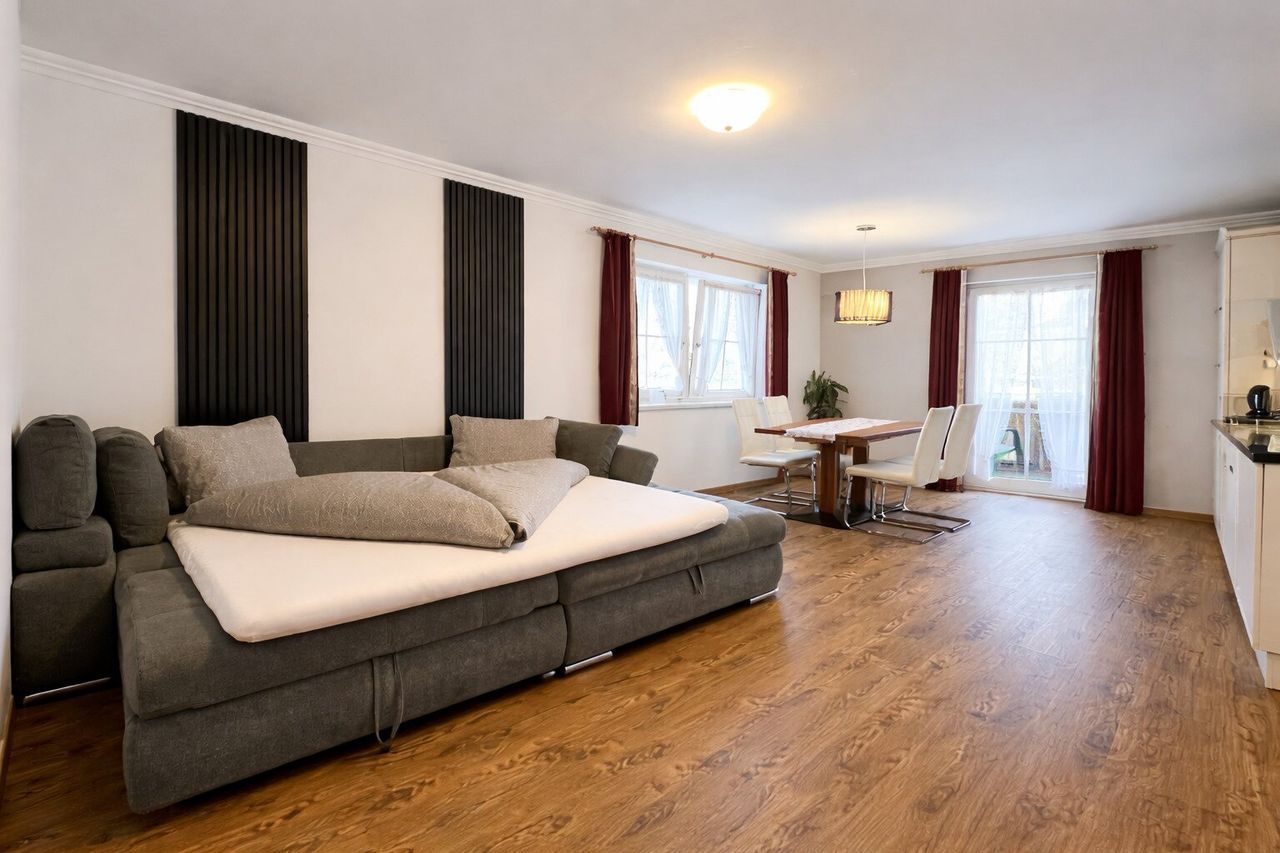 Diese Aufteilung ermöglicht unterschiedliche Nutzungskonzepte. Die Ebene kann als großzügige Gesamtwohnung genutzt werden oder in der bestehenden Struktur, etwa für Eigennutzung und Vermietung, Wohnen und Arbeiten oder als Kombination aus Haupt- und Nebenbereich. Durch eine einfache bauliche Maßnahme lässt sich die Trennung aufheben und die Fläche intern verbinden. Ebenso ist eine Nutzung über nur einen Zugang möglich.
