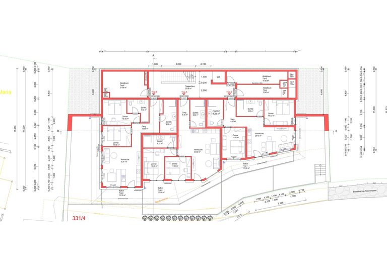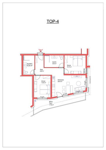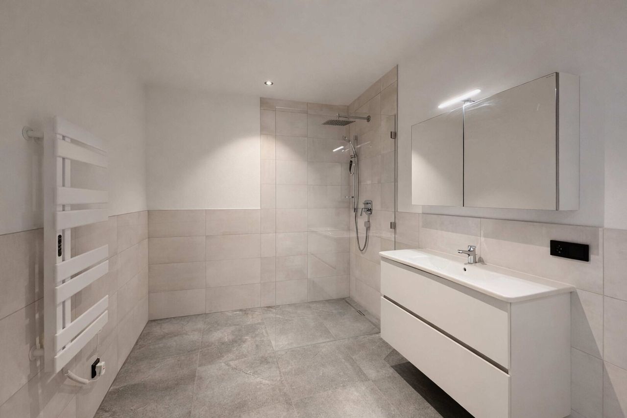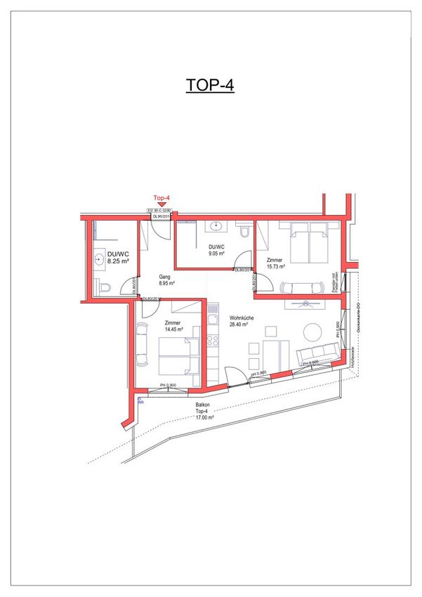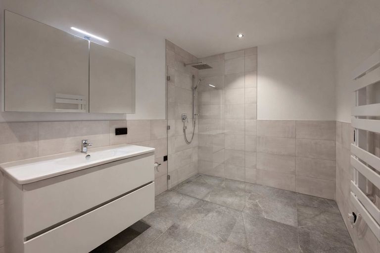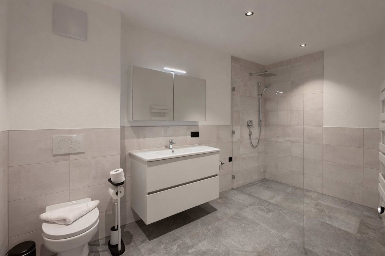 Das Ferienappartement Top 04 besteht aus einem großen Wohn- Küchenbereich, zwei Schlafzimmern für Doppelbett und zwei komplett ausgestatteten Badezimmern (lt. BAB) mit WC, Waschbecken, Waschbeckenunterschrank, LED Spiegel und eben begehbarer Rainshower-Dusche.
