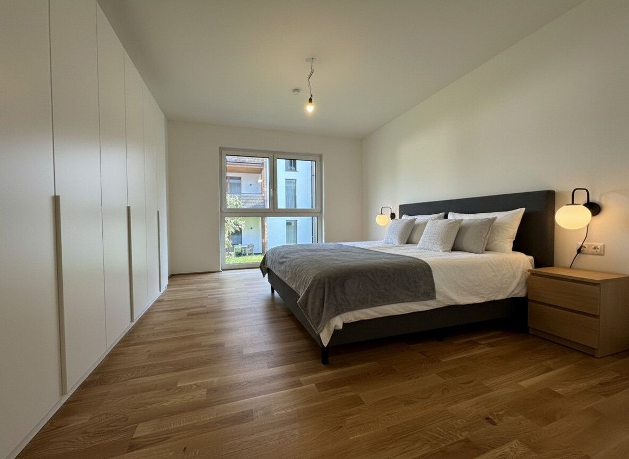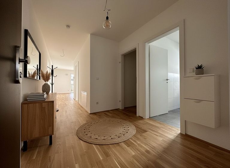 Die Ausstattung überzeugt durch hochwertige Materialien. Ein edler Eichenparkettboden sorgt für eine angenehme Wohnatmosphäre, während weiße Holzfutterstöcke und moderne Details den hochwertigen Charakter der Wohnung unterstreichen.