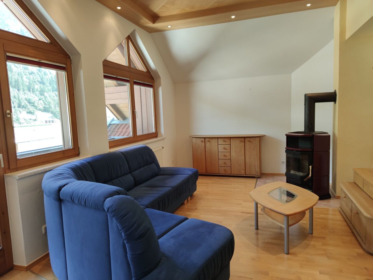 Das Wohnzimmer besticht durch die lichtdurchflutete Atmosphäre und dem Schwedenofen mit Sichtfenster.