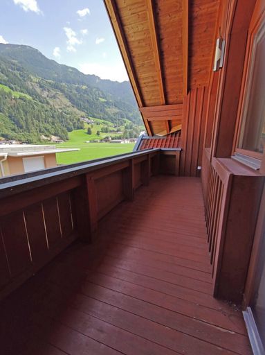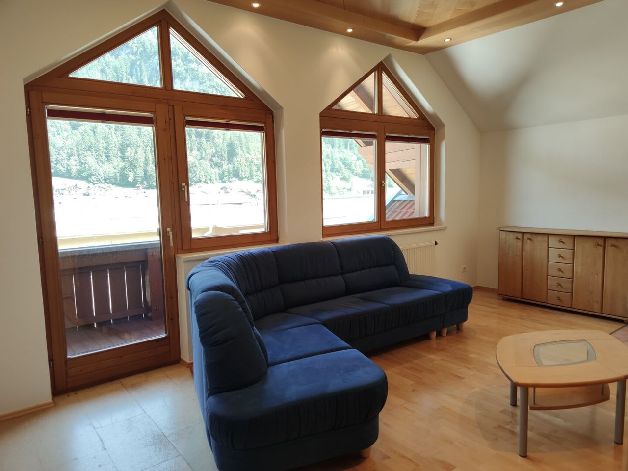 Vom Wohnzimmer aus gelangt man auf einen Balkon mit schönem Bergpanorama.