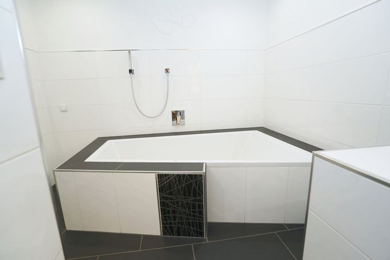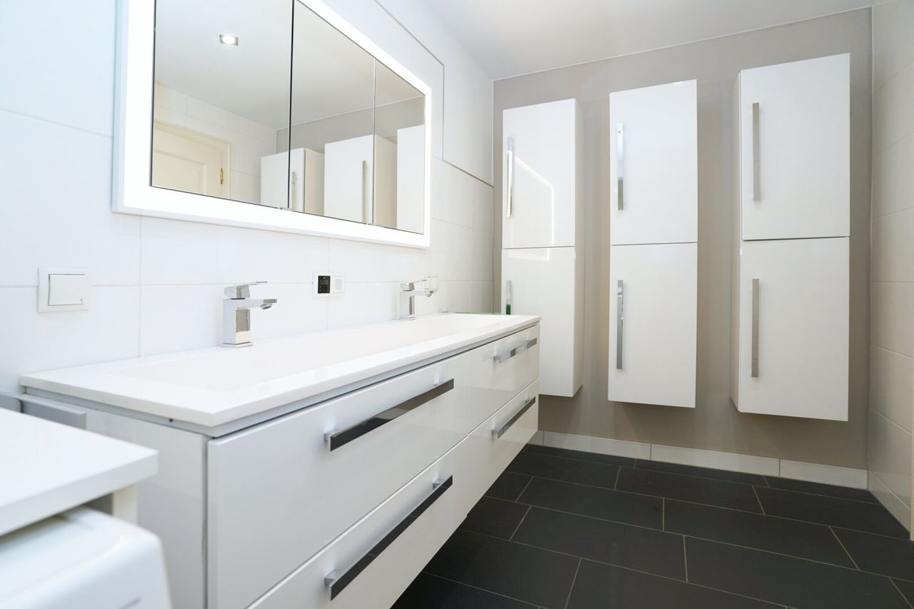 + großzügiges Badezimmer - ein angenehmer Rückzugsort mit viel Platz und Komfort mit Badewanne, Dusche, Doppelwaschbecken, Waschmaschinenanschluß und Handtuchtrockner
