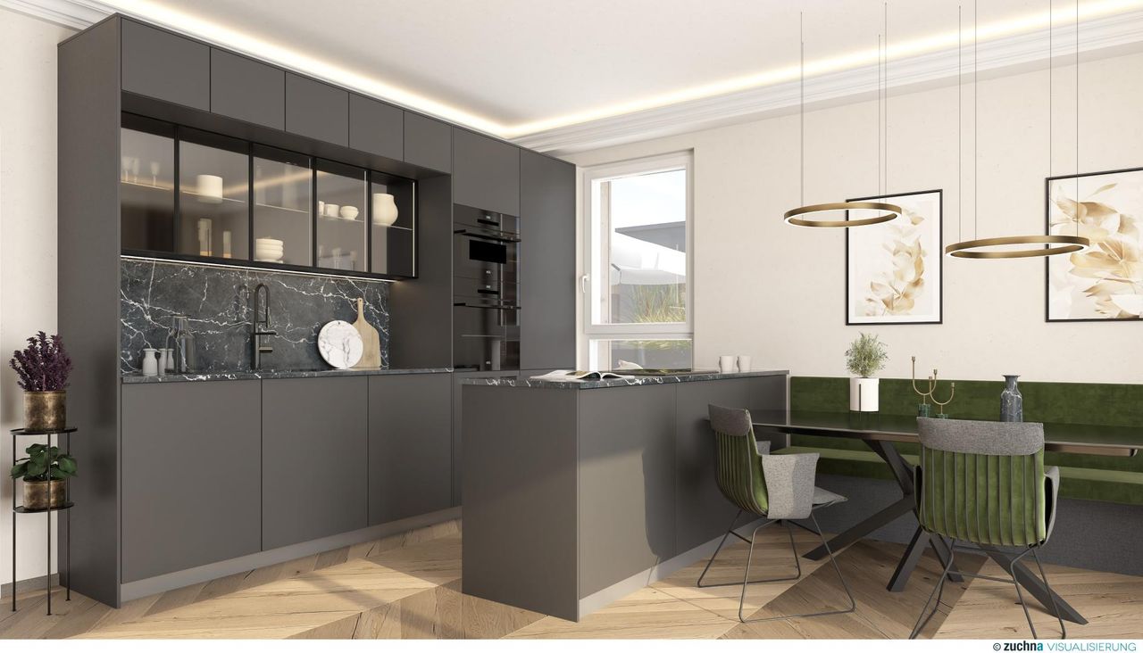 Die schicke Wohnung punktet mit qualitativ hochwertiger Ausstattung und hervorragender Raumnutzung. Im Eingangsbereich ist genügend Platz für eine Garderobe. Kochen, Essen und Wohnen sind in kommunikativen Wohnzonen vereint.