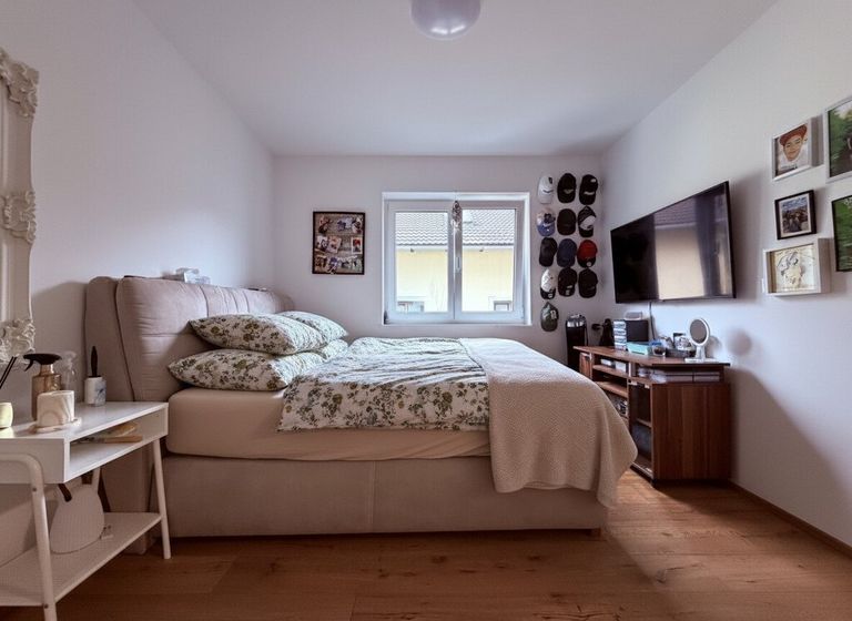 Große Fensterflächen schaffen lichtdurchflutete Räume, während elektrische Raffstores einen zeitgemäßen Sonnen- und Sichtschutz bieten. Ein eigener Autoabstellplatz sowie eine der Wohnung zugewiesene Kellerfläche runden das attraktive Gesamtpaket ab.