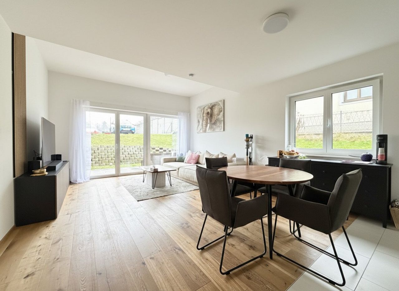 Das Herzstück der Wohnung bildet der helle Wohn- und Essbereich mit moderner Einbauküche. Von hier aus gelangen Sie direkt auf eine der beiden Terrassen und in den großzügigen Eigengarten. Eine weitere Terrasse ist vom Schlafzimmer aus begehbar und schafft einen zusätzlichen, privaten Rückzugsort im Freien.