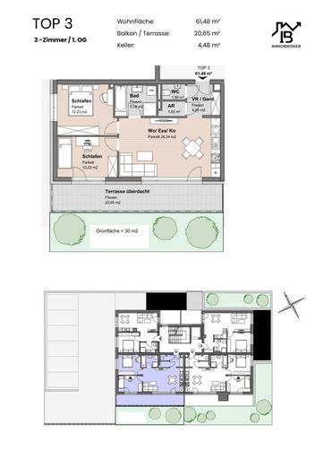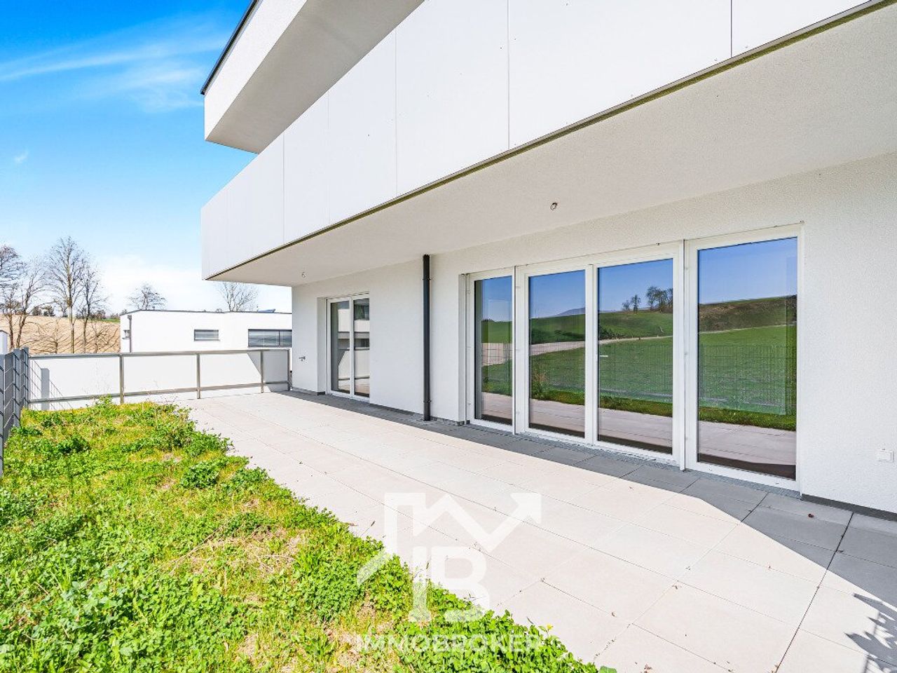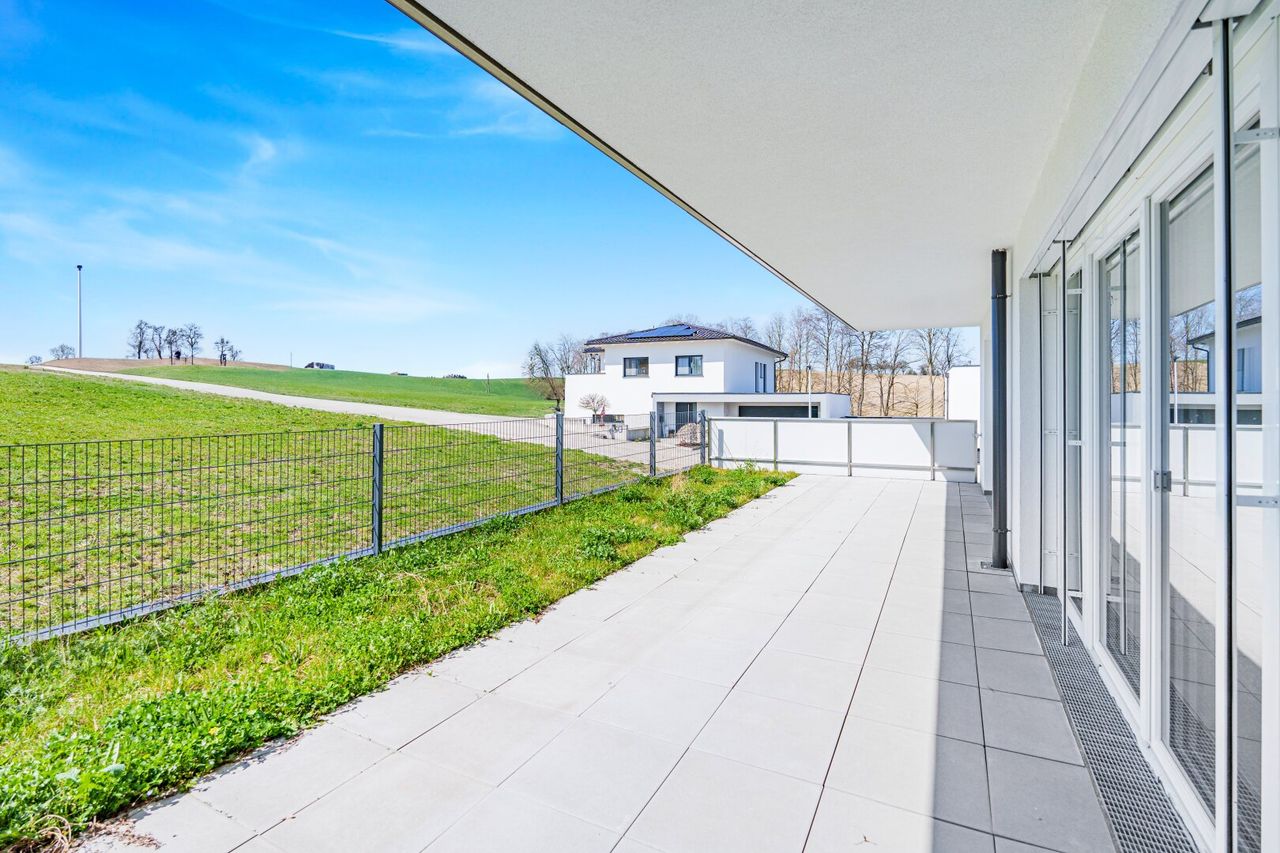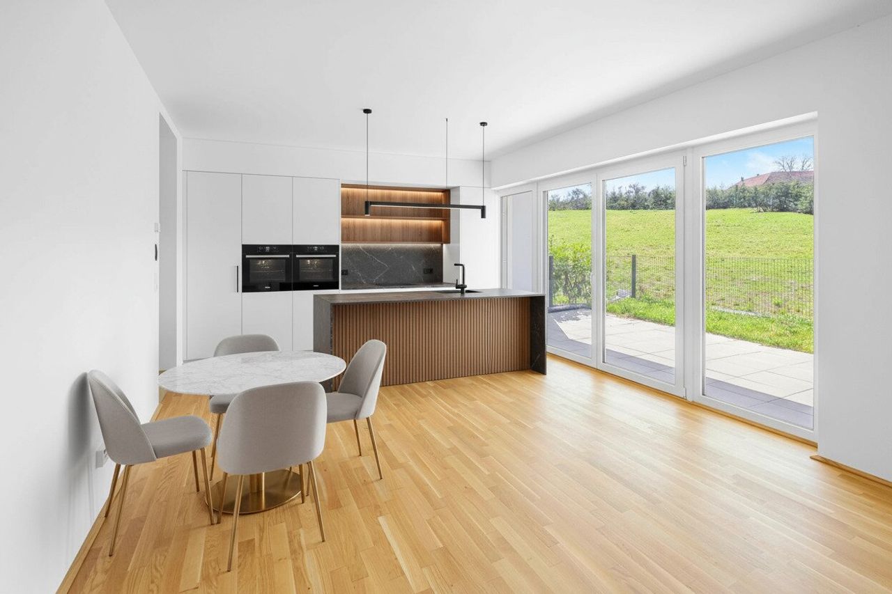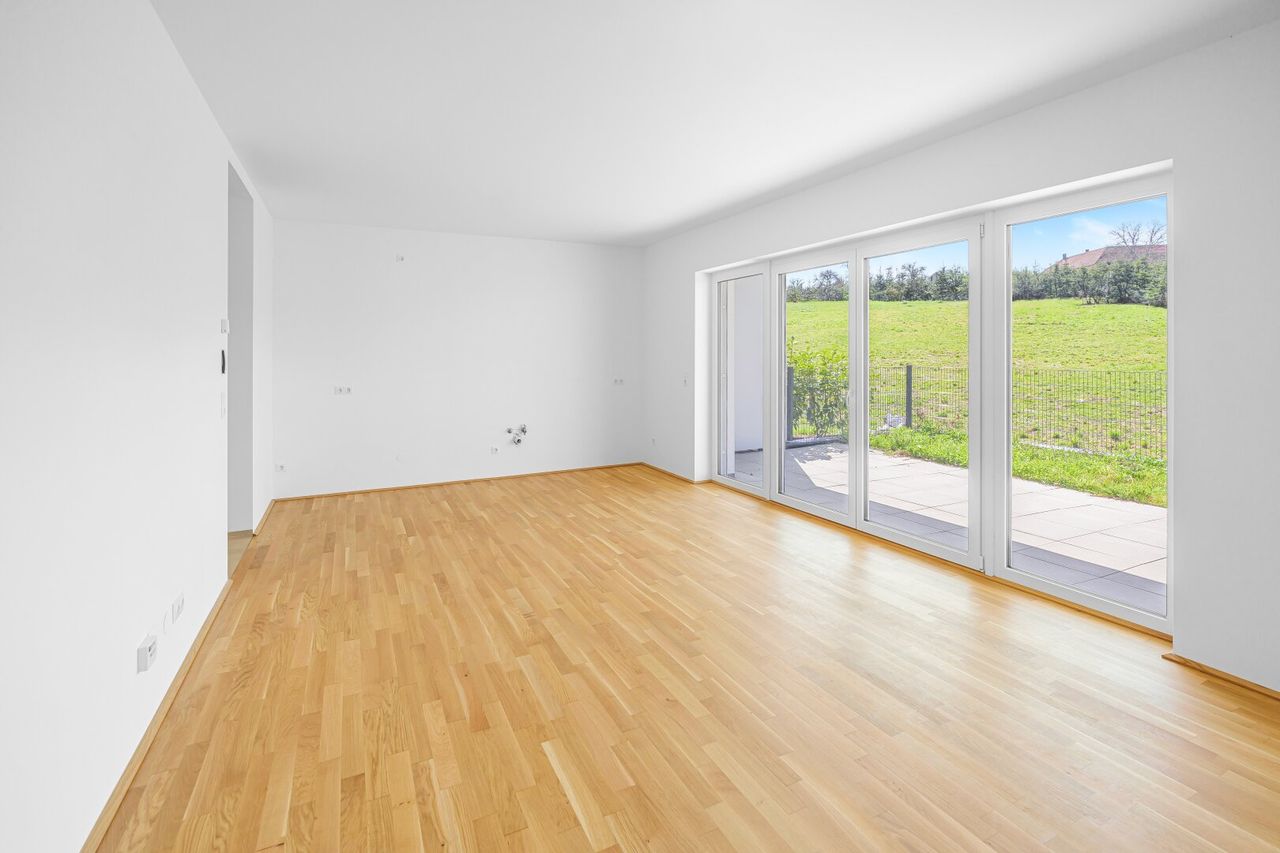 Diese hochwertig ausgestattete Wohnung im 1. Obergeschoss bietet nicht nur ein durchdachtes Raumkonzept, sondern auch eine großzügige überdachte Terrasse, die den Wohnraum perfekt ergänzt. Der offene Wohn-Essbereich mit fast 25 m² bildet das Zentrum der Wohnung – hell, einladend und mit direktem Zugang zur Terrasse.