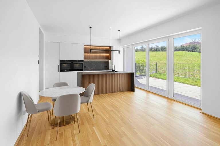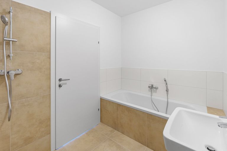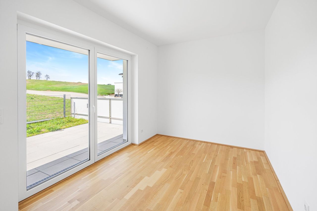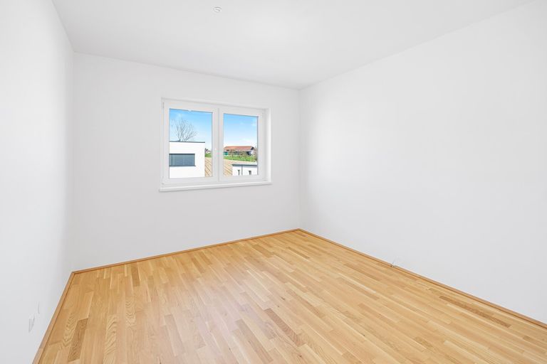 Zwei Schlafzimmer bieten flexible Nutzungsmöglichkeiten – als Schlafraum, Kinderzimmer oder Homeoffice. Das Badezimmer verfügt über eine Badewanne, zusätzlich gibt es ein separates WC sowie einen Abstellraum für Haushaltsgeräte oder Vorräte. Die Ausstattung lässt keine Wünsche offen: Fußbodenheizung über Wärmepumpe, Parkettböden, hochwertige Fliesen und Sonnenschutz inklusive.