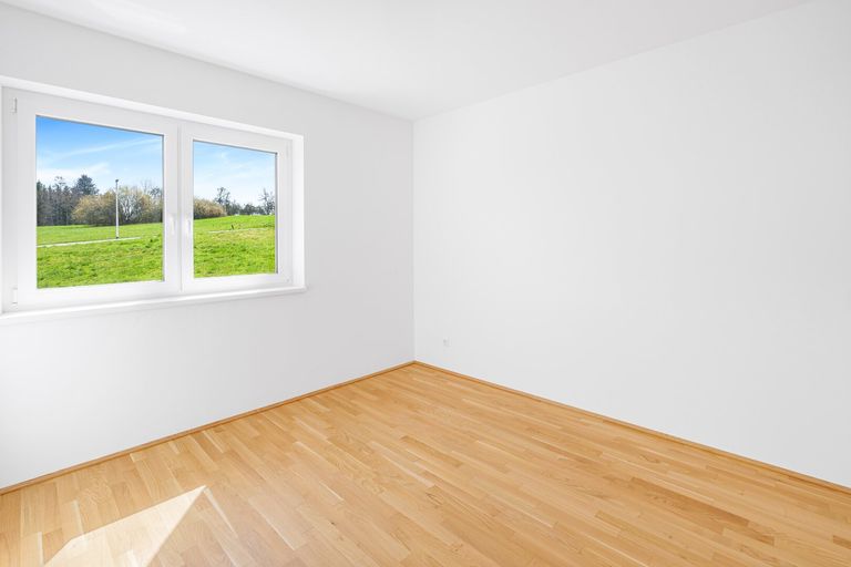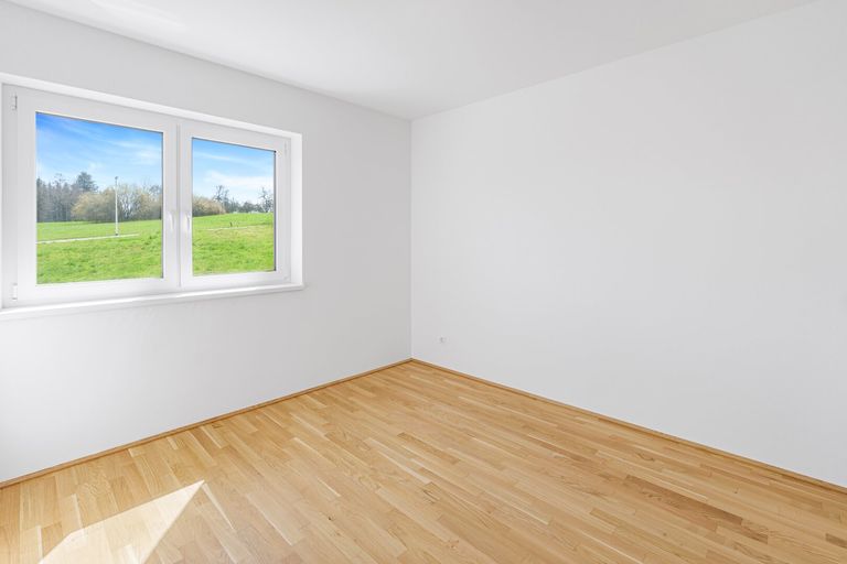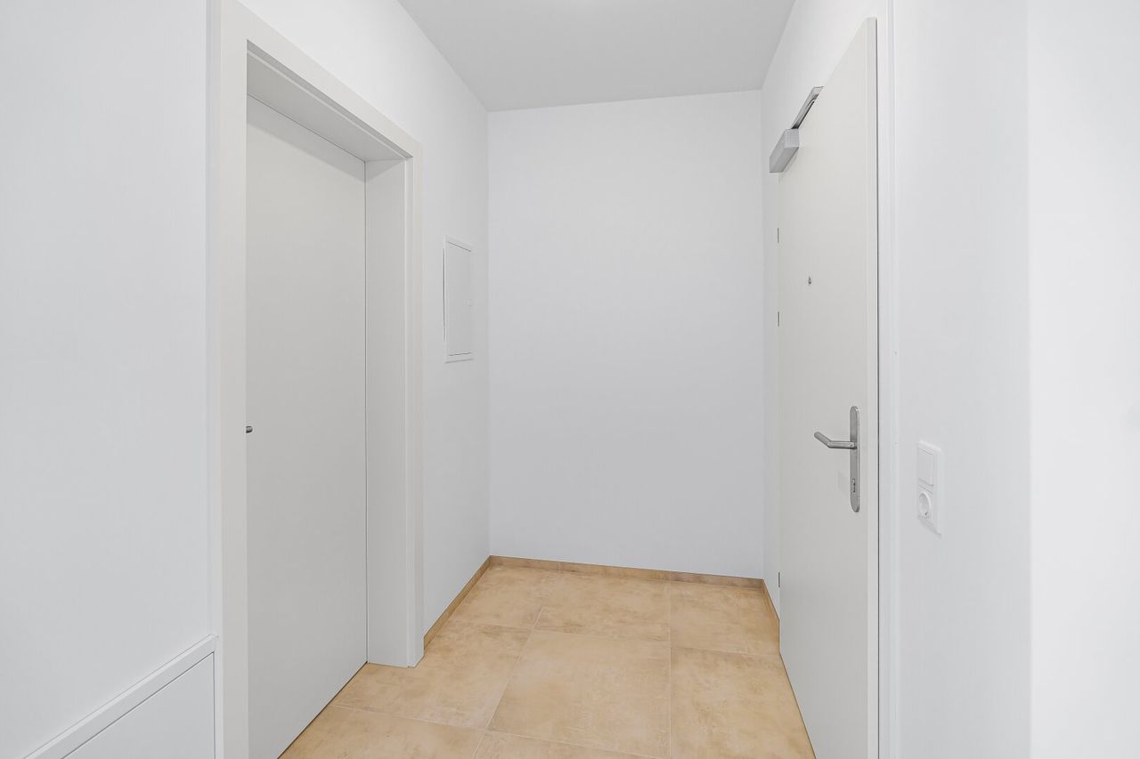 Ein freundlicher Vorraum und hochwertige Ausstattung – darunter Parkett, Fußbodenheizung, große Fensterflächen und elektrische Raffstores – sorgen für ein angenehmes Wohngefühl.