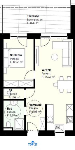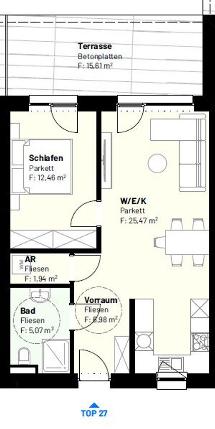Vorraum – Abstellraum – Bad – WC – Wohnküche – Schlafzimmer – Loggia