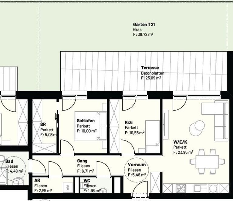 Vorraum – Abstellraum – Bad mit Dusche – separates WC – Wohnküche – 2 Schlafzimmer – Terrasse – Garten
