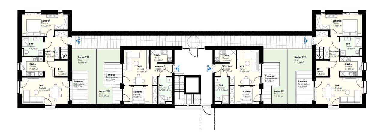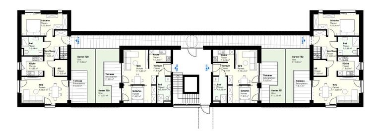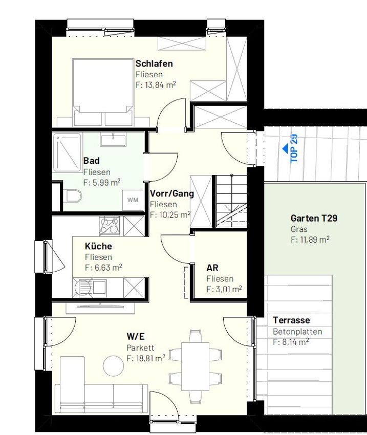 OG: Vorraum - Bad mit WC - Wohnküche - Schlafzimmer - Abstellraum - Dachgarten mit Balkon