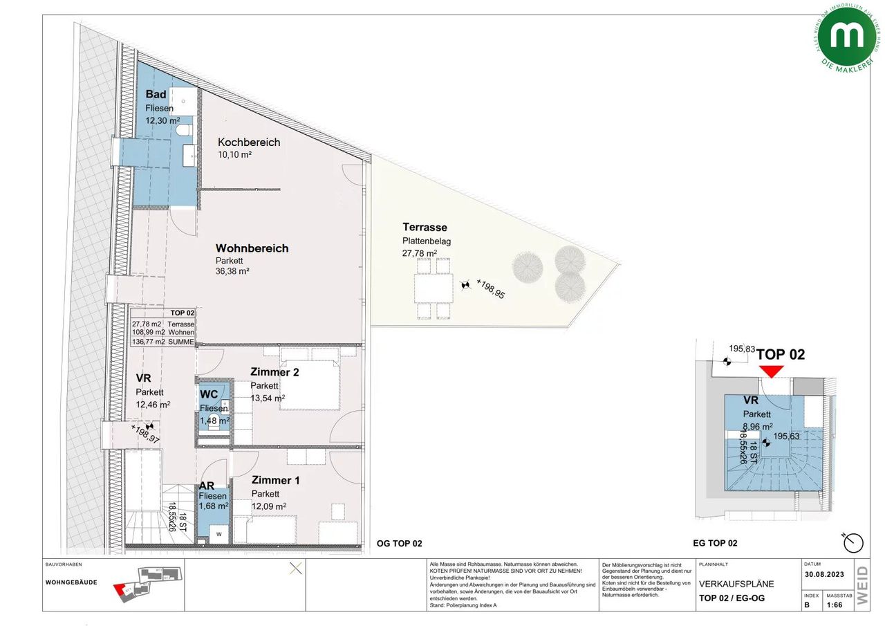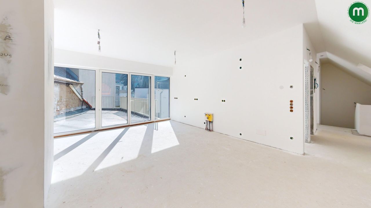 Die angebotene Eigentumswohnung liegt im 1. OG einer neu errichteten Wohnanlage und besticht mit einer durchdachten Raumaufteilung sowie einer großzügigen Terrasse. Mit einer Wohnfläche von rund 109 Quadratmetern, 2 Schlafzimmern und einer offenen Wohnküche wird hier ein perfektes Zuhause für Familien oder anspruchsvolle Paare geschaffen. Großzügige Fensterflächen sorgen für lichtdurchflutete Räume, während die südöstlich ausgerichtete Terrasse mit knapp 28 Quadratmetern genügend Platz für Erholung im Freien bieten. Dank des vielseitigen Grundrisses bietet sich hier ebenfalls eine Ausführung als 4-Zimmer-Wohnung an.