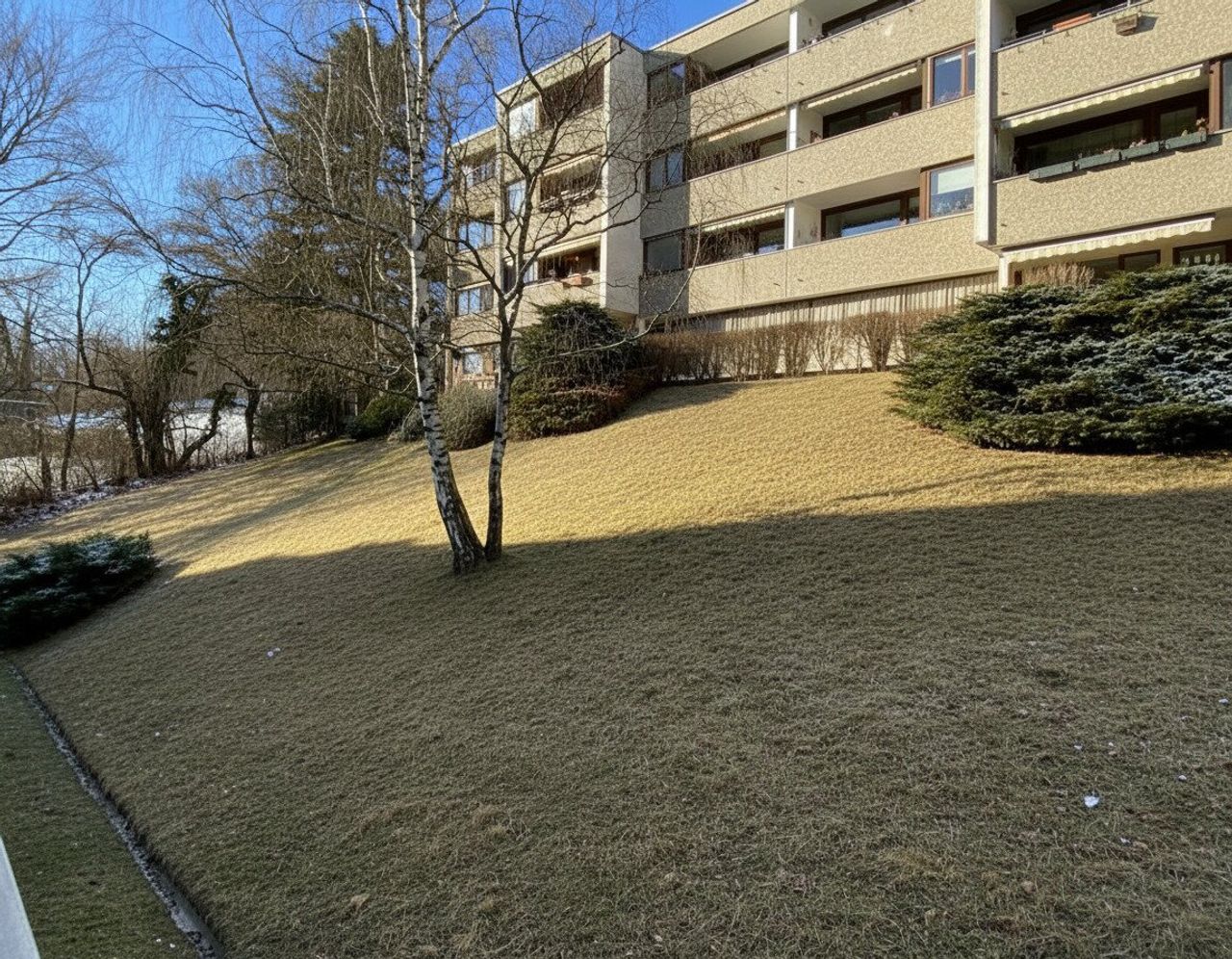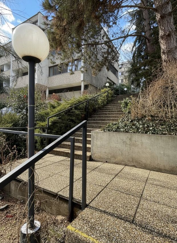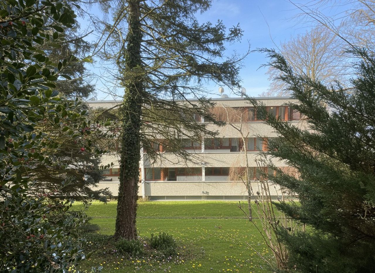 Diese Wohnhausanlage, errichtet in den siebziger Jahren, besteht aus drei Blöcken, die sich gegenseitig überragen. Solide gebaut, großzügig angelegt, viel Grün dazwischen. Keine modische Attitüde, sondern eine Struktur, die bis heute trägt. Wer hier wohnt, tut das nicht wegen eines Trends, sondern weil es einfach stimmig ist.