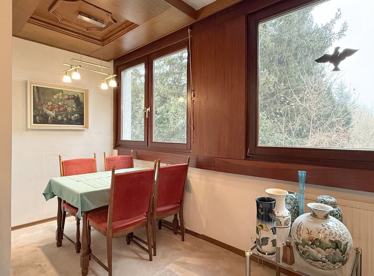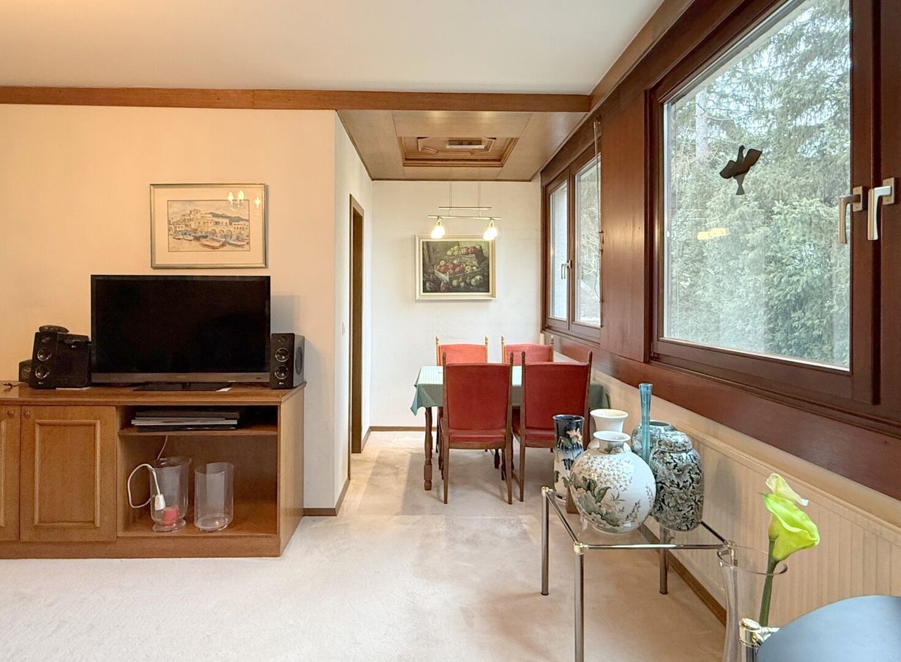 Die betreffende Wohnung befindet sich im Mittelteil der Anlage. Dadurch kann man wählen, ob man die Stiegen lieber hinauf- oder hinuntergeht. Kommt man von unten, steht das Auto am eigenen Stellplatz. Kommt man von oben, bringt man vielleicht den Einkauf ein Stück bequemer nach Hause. Einen Lift gibt es nicht – das gehört dazu. Aber wer gut zu Fuß ist, bekommt hier etwas, das viele Neubauten nicht mehr bieten: gewachsene Ruhe und Abstand.