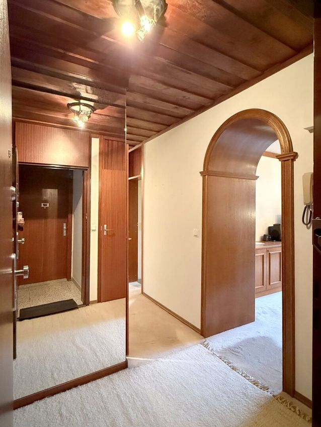 Der Eingangsbereich ist kompakt und geprägt vom typischen Stil der achtziger Jahre: viel Holz, warme Oberflächen, klare Linien. Man tritt ein und befindet sich zunächst in einer eher geschützten, fast introvertierten Atmosphäre. Die Wohnung zeigt sich hier noch zurückhaltend, beinahe bedeckt, als würde sie nicht gleich alles preisgeben wollen.