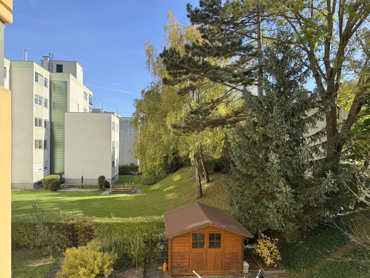 Zur Wohnung gehört noch ein fixer Parkplatz, und es gibt einen Garten, der zwar „allgemein“ heißt, sich aber nicht so anfühlt. Ein Garten, den man auch in echt benutzt, nicht nur betrachtet, mit einem Gartenhaus, Begegnungen, Sommerabenden und jener seltenen Hausgemeinschaft, die Nähe zulässt, ohne sie einzufordern. Gemeinsame Grillabende eingeschlossen.