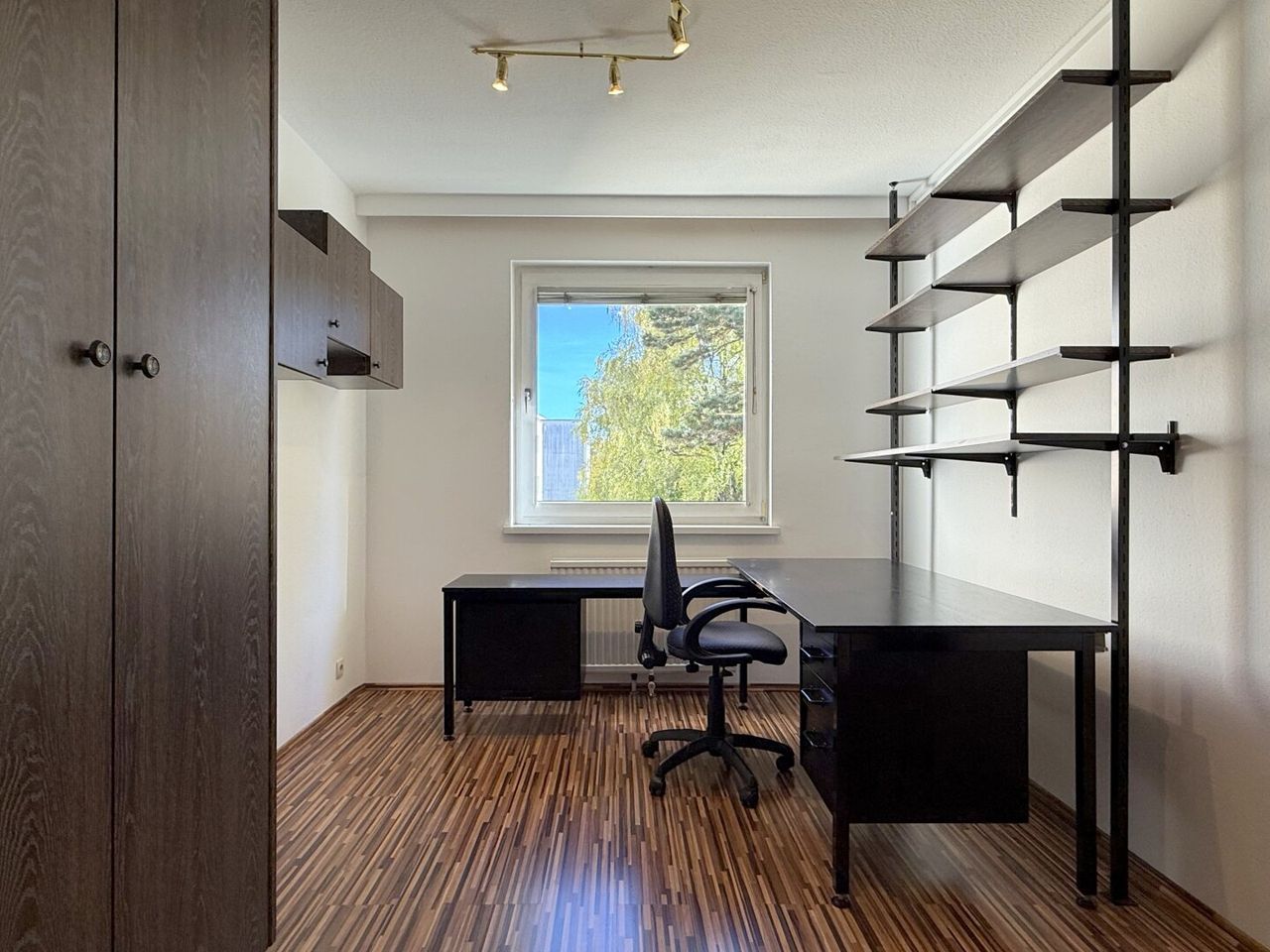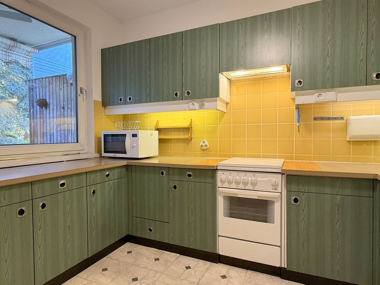Auf rund 72 m² entfaltet sich diese Wohnung in drei Zimmern, ohne Hast, ohne Drängen. Das Vorzimmer liegt in der Mitte, fast wie ein kleiner Verteiler zwischen Alltag und Rückzug. Links ein Raum, der heute arbeitet und morgen vielleicht etwas anderes sein darf, dahinter das Schlafzimmer, ruhig, geschützt. Rechts das Badezimmer, in jenem warmen Eierschalen-Orange, das die Achtziger nicht zitiert, sondern noch immer lebt. Kein Retro-Spiel, kein Stilzitat, sondern das Original – mit einem Stempel, der sich nicht entschuldigt. Man kann das ändern. Man muss es aber nicht. Das WC liegt jedenfalls separat.