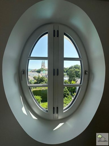 Das ovale Fenster bietet aus der großzügigen Wohnküche einen spektakulären Ausblick auf das Stift Klosterneuburg (blauer Pfeil im Plan).