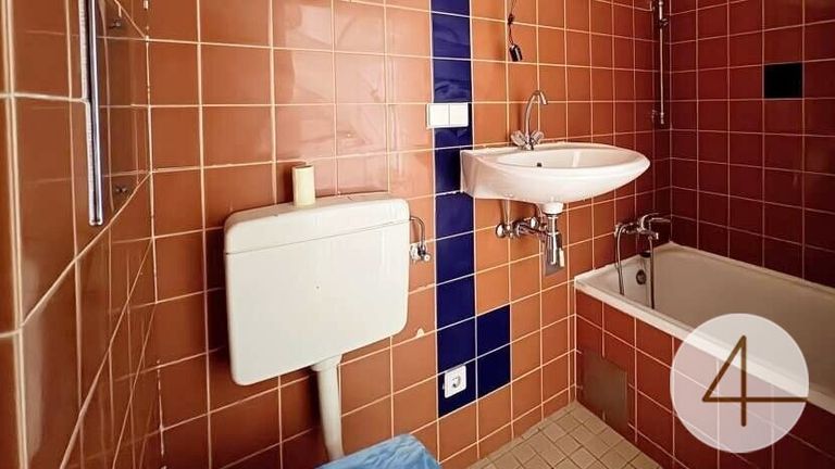 Das Bad mit Badewanne und WC befindet sich noch im 70er-Jahre-Stil und bietet Renovierungspotenzial.