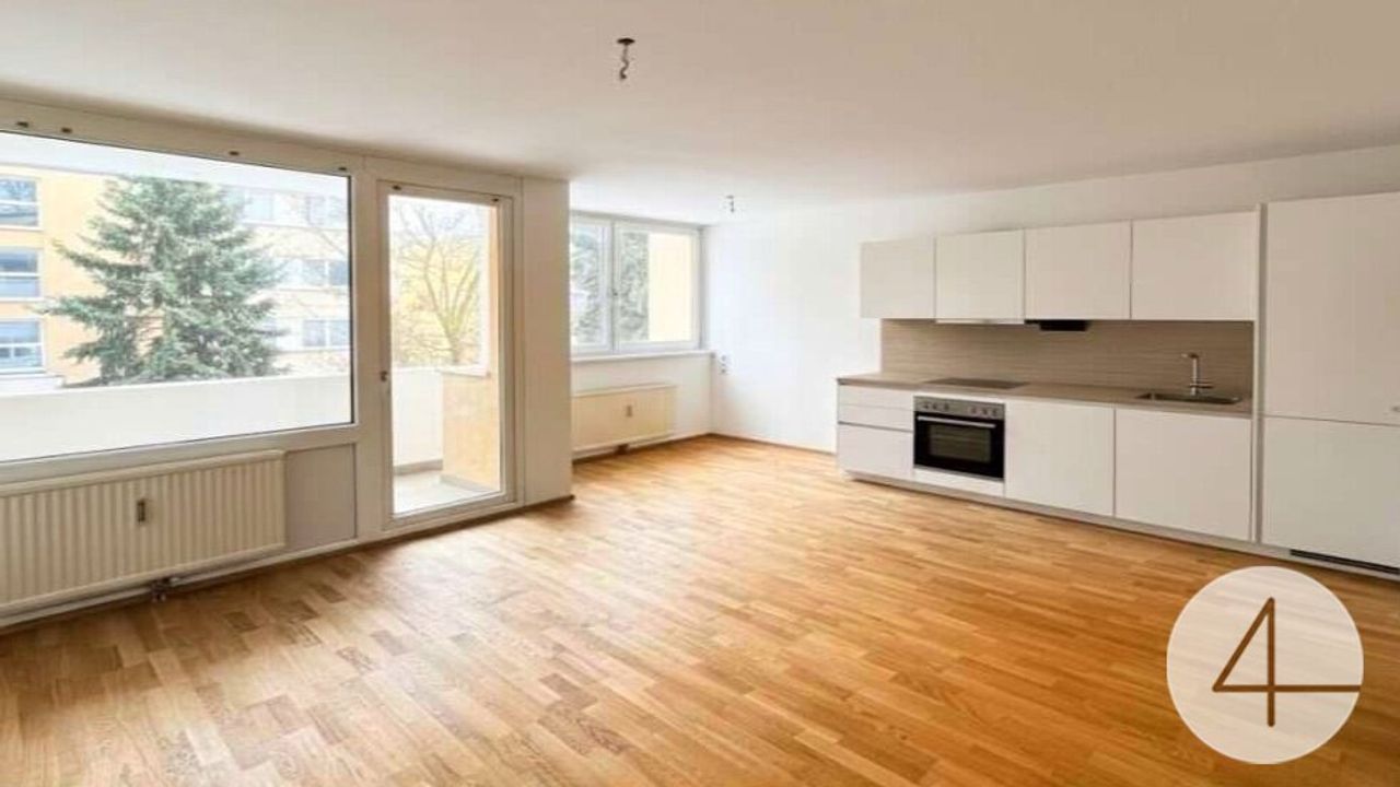Der offene Wohnraum mit Parkettboden und neuer Küche und Loggia wurde bereits saniert und warten nur mehr auf Ihre Möbel.