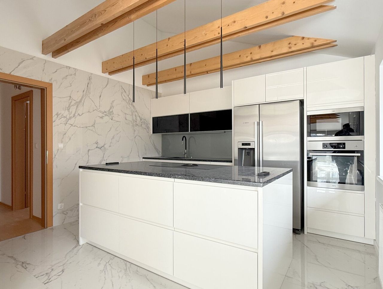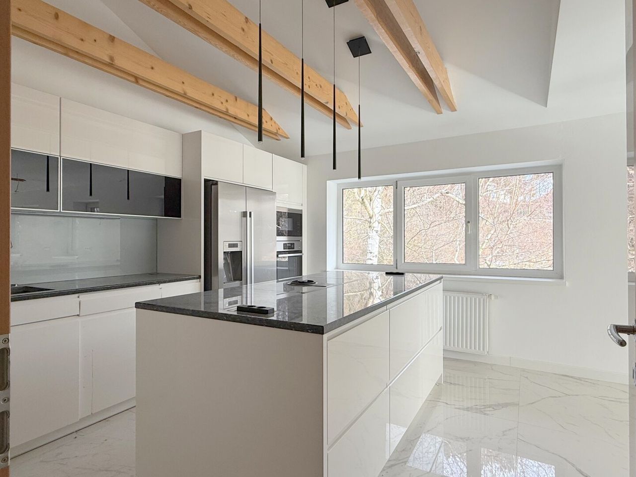 Die Küche ist offen in diesen Bereich integriert und fügt sich mit ihrer modernen Gestaltung stimmig ein. Sie wirkt hochwertig, klar und zeitgemäß – ein Ort zum Kochen, ohne sich vom Leben im Raum abzuschotten.