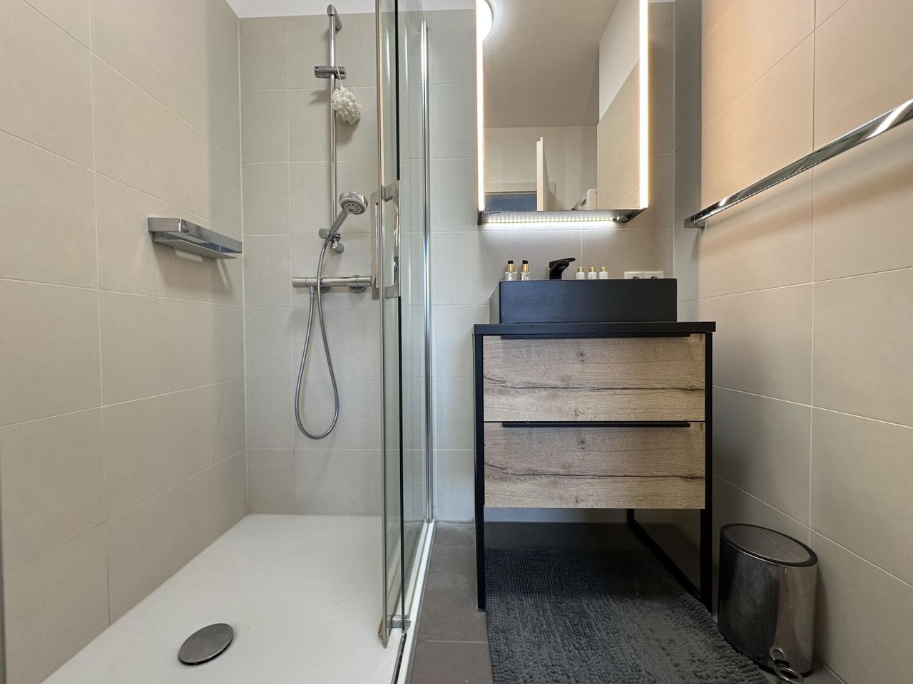 Das stilvoll ausgestattete Badezimmer bietet: