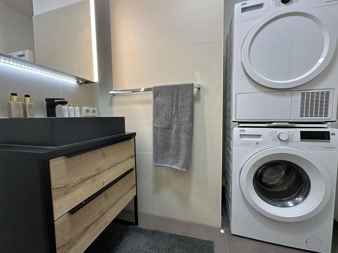Hinter der Tür befindet sich eine praktische Nische mit Waschmaschine und Trockner, welche auf Wunsch ebenfalls in der Wohnung verbleiben.