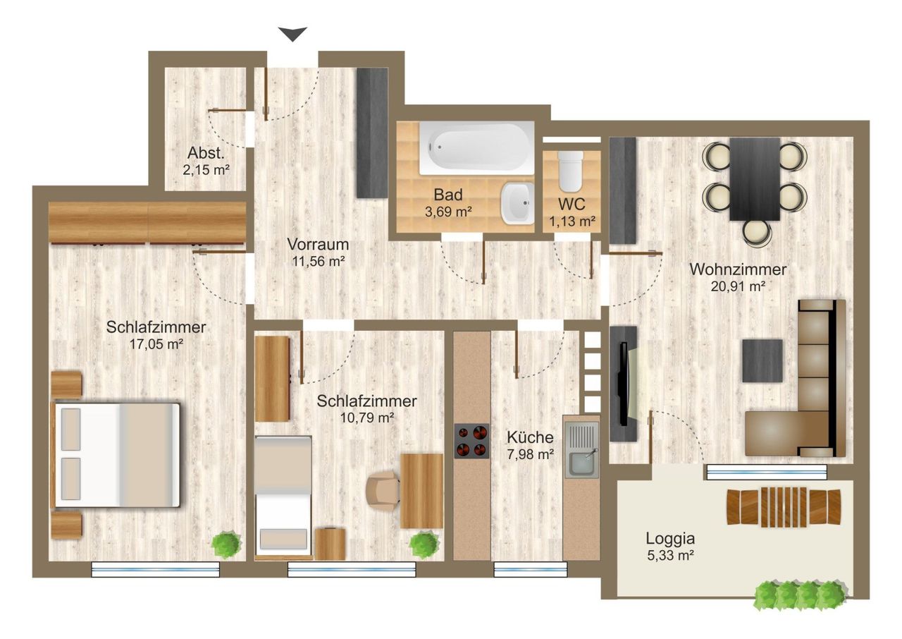 Die gut geschnittenen Räume umfassen ein geräumiges Vorzimmer, ein großes Wohn-/Esszimmer mit Zugang zum Balkon, eine komplett ausgestattete Küche, ein Schlafzimmer sowie ein weiteres Zimmer, das sich ideal als Kinder- oder Arbeitszimmer nutzen lässt. Ein Badezimmer, ein separates WC, ein praktischer Abstellraum sowie ein Kellerabteil sorgen für zusätzlichen Komfort. Ein Garagenplatz gehört ebenfalls zur Wohnung und ist im Preis inbegriffen.