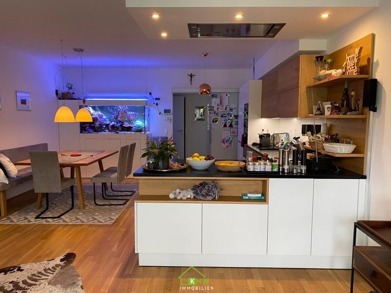 Eine moderne Einbauküche (Steinplatte und Miele-Geräte!), Parkettböden, Klimaanlage, Balkonschiebetüren, elektrische Rollläden sowie ein Insektenschutzgitter sprechen für eine hochwertige Ausstattung.