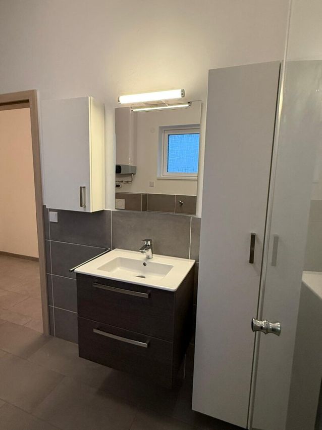 - Badezimmer mit Dusche, Waschbecken, Waschmaschinenanschluss und WC