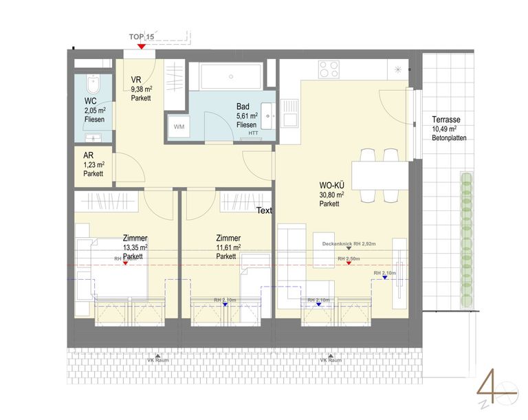 Vorraum 9,38m² Wohnküche 30,80m² Bad 5,61m² WC 2,05m² AR 1,23m² Zimmer 13,35m² Zimmer 11,61m² Terrasse 10,49m²