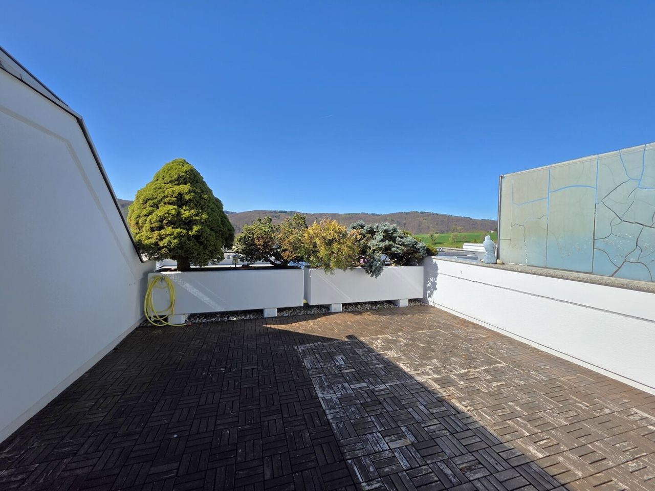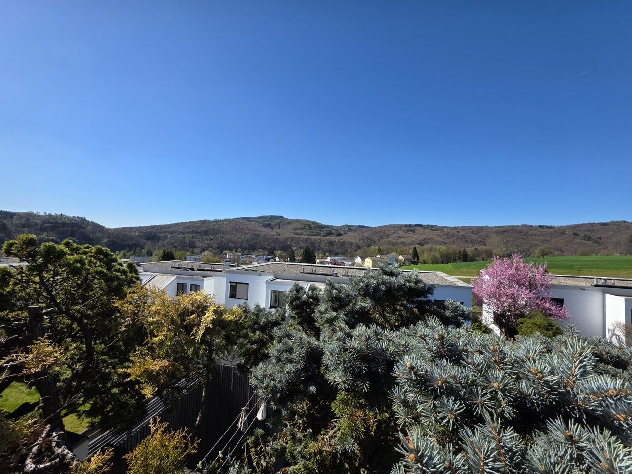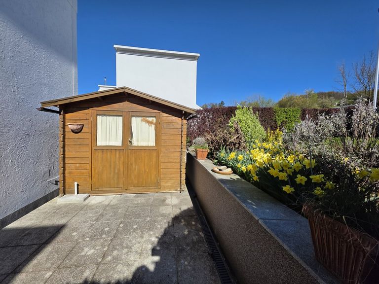 Ein besonderes Highlight ist die großzügige Terrasse mit ca. 22,44 m², die einen herrlichen Blick auf den Kürnberg bietet – ideal für entspannte Stunden im Freien. Der rund 100 m² große Eigengarten lädt zusätzlich zum Verweilen, Gärtnern oder Spielen ein.
