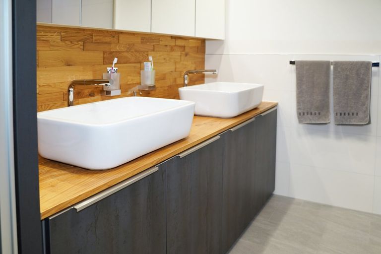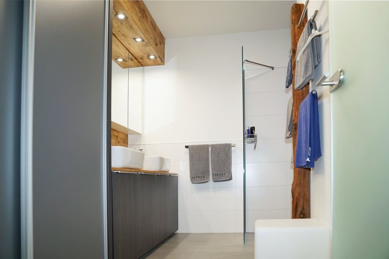 + Bad mit Einbau-Schiebetürschrank für Waschmaschine, Trockner & Aufbewahrungen, 2 Aufsatzbecken, Spiegelschrank, bodentiefe Dusche - WC extra