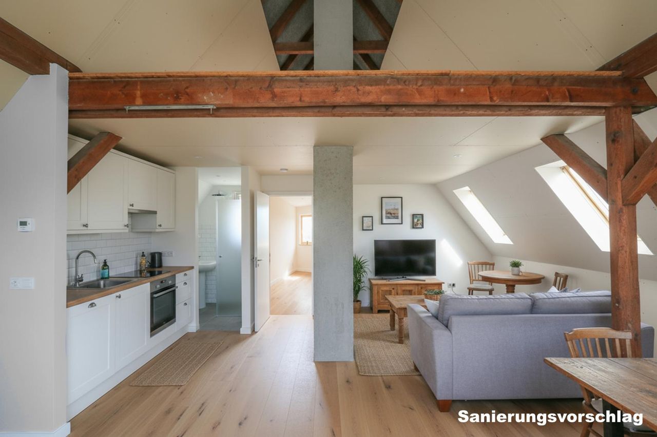 Die Basis ist solide: Gipskartonwände sind bereits teilweise installiert, und darunter wurde eine Dämmung verlegt. Stromleitungen und Verkabelungen sind vorhanden, ebenso Leitungen für WC und kleinere Wasserinstallationen. Ein vorhandener Plan kann übernommen oder nach Wunsch angepasst werden.