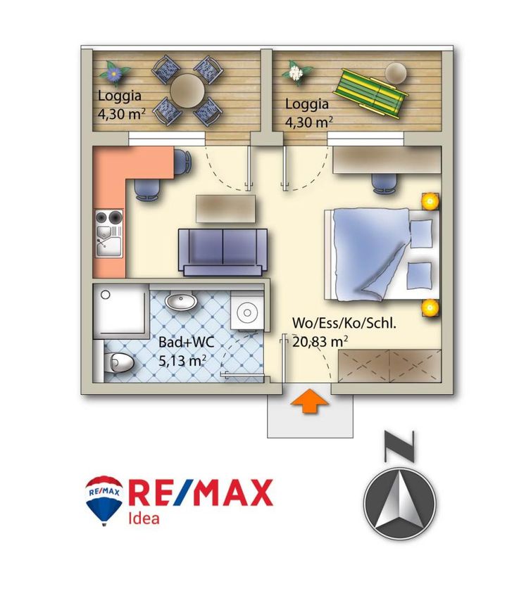 * Raumaufteilung: Wohn-/Schlafbereich mit Küchenzeile, Badezimmer mit Dusche und WC, 2 Loggias
